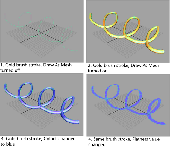 With the Draw As Mesh option, you can preview the rendered look of your strokes interactively in the scene view; you don't have to view them in the Paint Effects panel. With Draw As Mesh turned on, you can see the Paint Effects strokes in the scene very close to what they will be when rendered. You can tumble around and see what they look like from any camera view, and you can model on other objects in the context of the Paint Effects in the scene. If you want to do any modeling on the stroke objects, you need to convert them from Paint Effects to polygons. One of the biggest benefits of working with Draw As Mesh turned on is that you can edit brush attributes and see the changes happening to the stroke (Paint Effects shape) in the scene view.