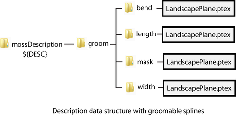 For a groomable splines Description (called MossDescription for example), Ptex files are created for attributes modified by the Grooming brushes. Maya generates the following default data structure: