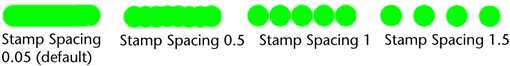 Clicking the brush on a surface creates a stamp. A brush stroke is made up of many overlapping stamps. You can set how the stamps overlap. If you set Stamp Spacing to 1, the edges of each stamp just touch each other. If you set the spacing to be greater than one, there will be spaces between the stamps. If you set the spacing to be less than one, the stamps will overlap.