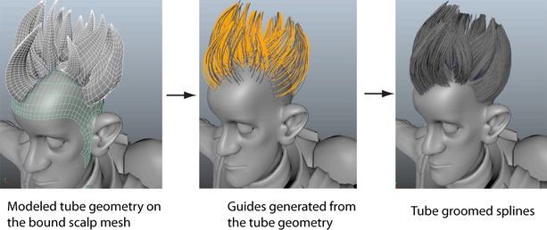 Use tube-shaped polygon meshes to define the shape of a default spline hair groom. XGen generates guides from the shape of the modeled tube objects.