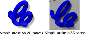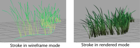 The Paint Effects Tool works like a paintbrush. When you drag with the Paint Effects Tool, you create a stroke. A stroke is a collection of curves with attributes that define how the paint is applied along the stroke path. You can paint strokes on a 2D canvas to create 2D images or textures, or you can paint strokes in a scene to create paint effects in true 3D space.