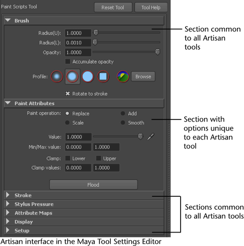 Artisan uses the Maya Tool Settings editor to set tool properties. All Artisan tools share common options, which are described in Artisan Tool Settings.