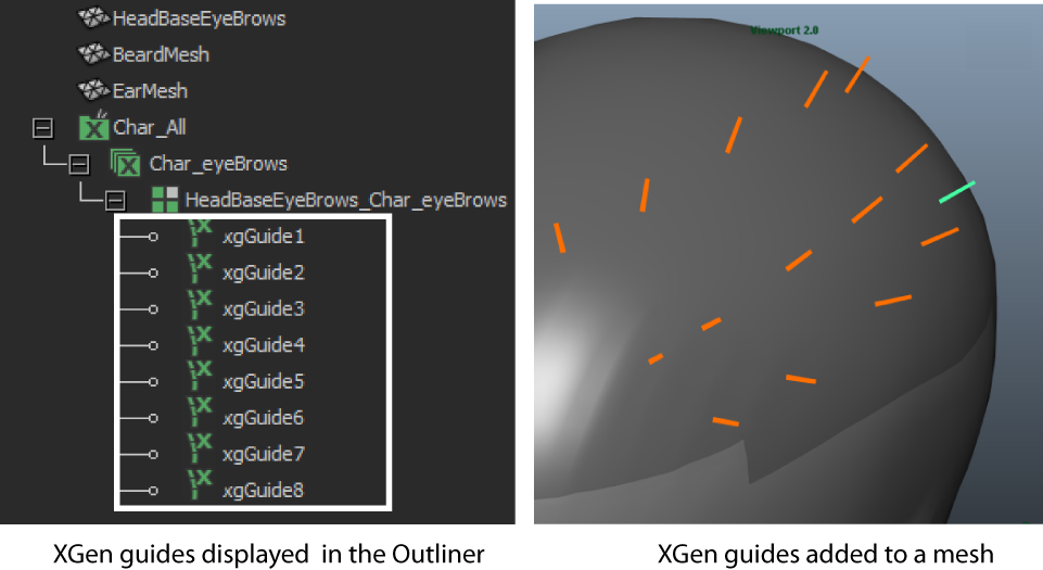 You can use XGen guides to place, shape, and orient primitives generated on polygon meshes. Think of guides as proxy versions of primitives, which determine where primitive generate and how they appear. You can specify that you want to use guides when creating a new description. You cannot use guides when generating groomable splines. See Create hair or fur with spline primitives.