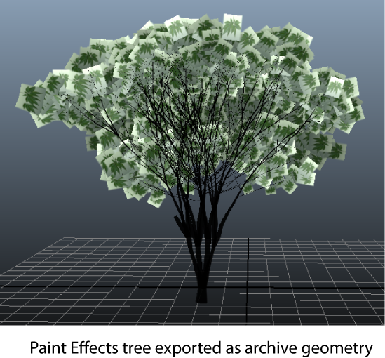In this section, a Maya Paint Effects tree is converted to custom archive geometry, and then added to the scene.