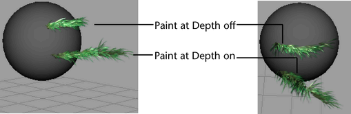 When Paint at depth is on, the depth value of the stroke is determined when you first click the brush, and is then fixed at that value. If the stroke has tubes, the tubes “grow” from the plane orthogonal to the path at each step. This is useful for creating effects where you want tubes to sprout out from the path (for example, a fountain, smoke from a chimney, or a tail). The Paint Effects Tool cursor changes to project ortho-normal to the view, to indicate you are painting at depth.