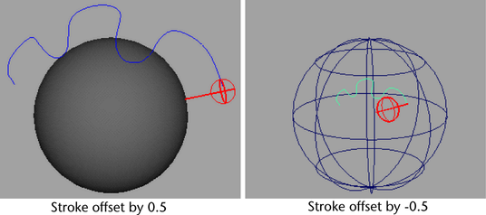 Set the distance (in world units) you want the next stroke offset from the object or plane you paint the stroke on. Offsetting the stroke is not the same as translating it. When you offset the stroke, the stroke is created normal to and a uniform distance from the stroke path, so if the surface is convex, the stroke will be bigger than the stroke path. Similarly, if the surface is concave, the stroke will be smaller than the stroke path. The cursor changes to reflect the displacement value.