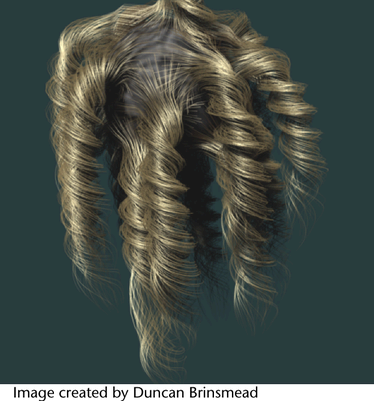 You can create frizzy or kinky hair by using the Curl displacement combined with a high Curl Frequency and a large Sub Segment count. The high Sub Segments may slow down refresh, so you might want to lower the hair system Display Quality when doing this for faster playback. Curls are the same for all hairs in a clump. If the clump is narrow and the curl displacement is large, this will create corkscrew shapes. For “afro” style curls, or partly ironed kinky hair you might want to have less regular curling. The Noise displacement is different from the curl in that each hair within a clump gets a different displacement. Experiment with typing values outside the slider range for Noise, such as 2 or 3. Also, to see the effect of high frequency values, you will need to increase the Sub Segments.