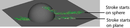 - Because the stroke attempts to stay on the surface, the result may be unexpected. For example, suppose you have a sphere intersecting a plane. If you start painting on the sphere, once the brush leaves the sphere, it looks for another surface to continue on, the plane in this case. However, if you start to paint on the plane, the brush never leaves the surface, so the stroke doesn’t continue on the sphere.