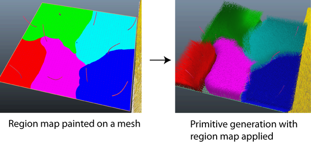 If you create a Description with guides, you can use a region map to override how the guides interpolate the placement and behavior of primitives on the mesh.