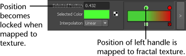 Consider the following example. Two color entries have been entered into the ramp, the first of which has its position mapped to a fractal texture.