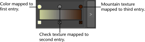 Consider the following example. Three entries have been entered into the ramp, the first a color entry, the second a check texture, and the third, a mountain texture.