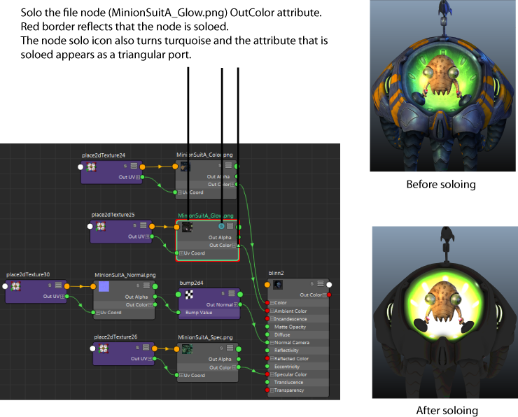 To improve this workflow, use this feature to solo a shading node. Soloing allows you to preview the effect of a specific node output attribute; that is, the results of the upstream portion of the graph leading up to that node’s output attribute. By soloing a node, you see its contribution without having to modify your shading graph, and can therefore easily identify problems while working through a complex shading network.