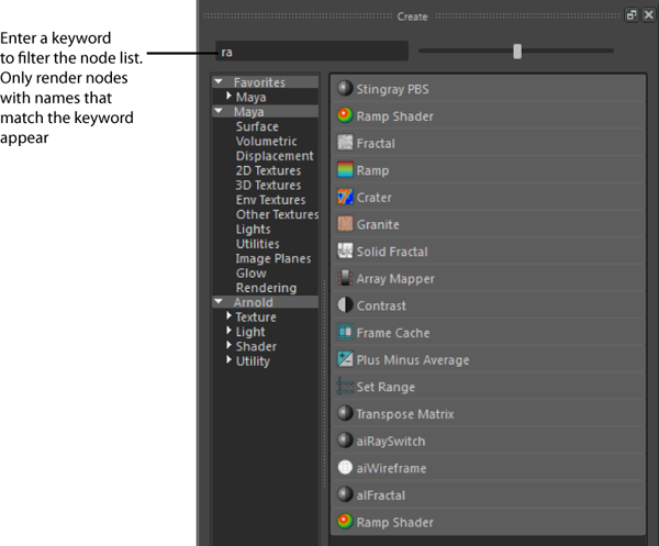 Enter the keyword for the render node that you want to create. As you enter a keyword, the right panel of the Create tab updates in real time and only render nodes with names that match what you entered are displayed.