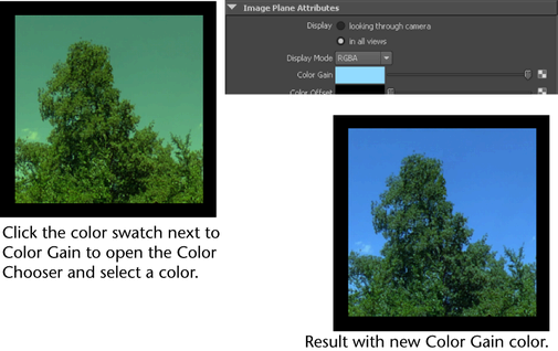 A scaling factor applied to all colors in the image plane. Maya multiplies all colors in the image plane by the Color Gain color. For example, you can color correct an image plane that appears too green by setting the Color Gain color to a shade of blue. The default color is white (no effect).