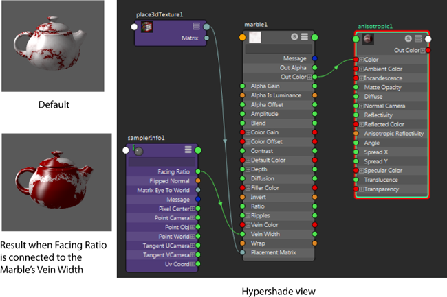 In this first example, the SamplerInfo’s Facing Ratio attribute is connected to the Marble texture’s Vein Width.