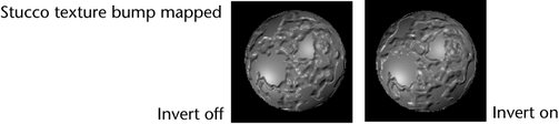 Reverses all texture colors (black becomes white, white becomes black, and so on). Invert is off by default. For example, you can change a bump or displacement map’s raised regions to depressions and vice versa by setting Invert on or off.
