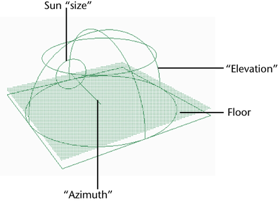 The angle (in degrees) of elevation of the sun relative to the floor. The valid range is -90 to 90. The slider range is 0 (sunrise/sunset) to 90 (midday). The default value is 45.