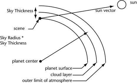 For example, if Sky Thickness is 1000 and Sky Radius is 50, the outer radius of the sky is 1000 x 50 = 50 000 units, and the radius of the planet is (1000 x 50) - (1000 x 1) = 49 000 units.