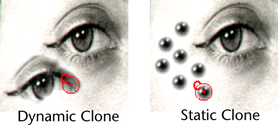 With dynamic cloning, the clone source moves as you paint. In the following DynamicClone example, a small area of the top eye was set as the clone source. Painting below the eye gradually reproduced the top eye. In the StaticClone example, the pupil was cloned and stamped.
