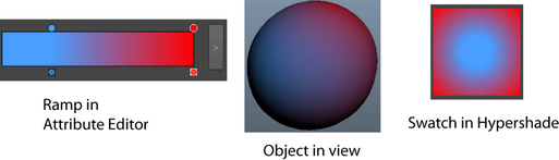 The direction of the color ramp. The default is V Ramp. The following shows what happens when you select the Circular Type and adjust the colors of the Ramp swatch in the Attribute Editor (see also Ramp below).