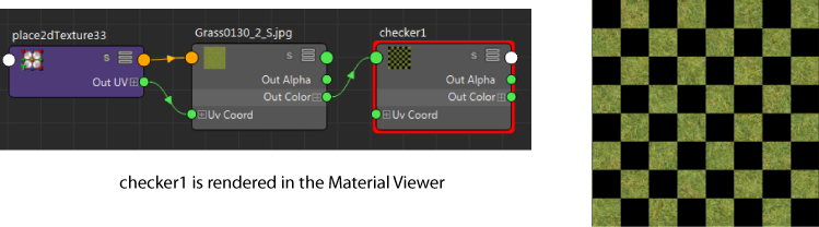 In this example, checker1 is rendered in the Material Viewer. To see the grass reference texture in the Material Viewer, solo the file node.