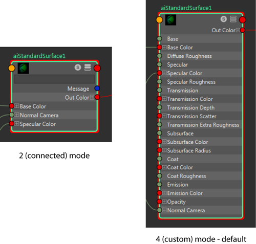 When you first create a node in the Hypershade work area, its most commonly used attributes are displayed (hotkey 4 mode in the Node Editor). You can display nodes in the Hypershade in the same view modes as you can in the Node Editor: 1 (simple), 2 (connected), 3 (full), 4 (custom). You can also use hotkey 5 to display the node type instead of its name, or not to show a node title at all.