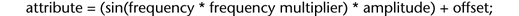 With a steadily increasing or decreasing argument, the sin function returns steadily increasing or decreasing values between -1 and 1. This is useful for creating rhythmic, oscillating changes in attribute values.