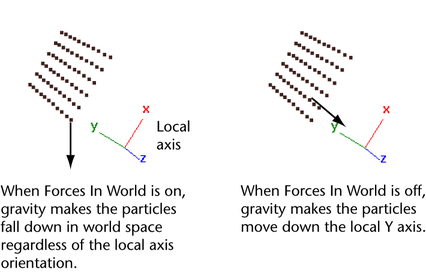 If you have not keyed, parented, or otherwise controlled the transform attributes of a particle object, you can turn off Forces In World to speed up dynamic calculations for the object. When Forces In World is on, Maya does extra computations to convert world space to local space coordinates.
