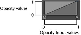 The vertical component represents the Opacity values from 0 (totally transparent) to 1 (totally opaque), the horizontal component represents Opacity Input values from 0 to 1. By clicking on the graph and dragging the points, you make a curve that defines what the opacity is for any input value. The default is a linear 1-1 relationship—input values (for example, Density) of 0 have no opacity, values of 0.5 have an opacity of 0.5, values of 1 have an opacity of 1. For more information on using single-value ramps like this, see Set attributes using ramps.