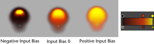 Color Input Bias adjusts the sensitivity of the selected Color Input. Input values of 0 and 1 always map to the start and end of the ramp, while the bias determines where in the ramp a value of 0.5 maps. If the Input Bias is 0.0 then a Color Input value of 0.5 maps to the exact middle of the color ramp. Instead of values that are very close using the color at one part of the ramp, you can use the full range of colors to represent the values.