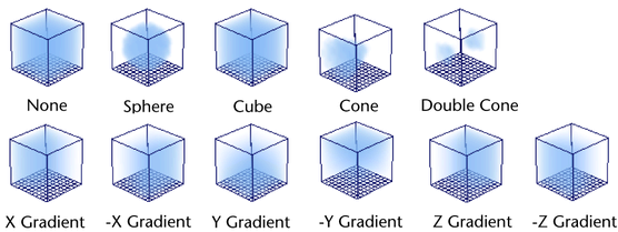 The other options all set the Color Input to the color corresponding with the value from the grid. For example if Density is the Color Input, the color at the start of the color ramp is used for Density values of 0 and the color at the end of the ramp for Density values of 1.0. Midrange values map according to the Input Bias.
