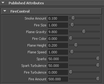 The easiest way to modify an effect is to adjust the asset's published attributes. These attributes provide control to the specific characteristics of the effect. For example, the Fire asset has attributes that adjust flame density, speed, and height as well as the amount of emitted sparks.