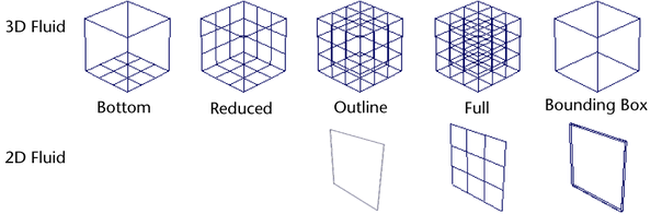 The fluid container displays as a bounding box, with full grid lines representing each voxel. For 2D fluids, this setting displays a detailed grid.
