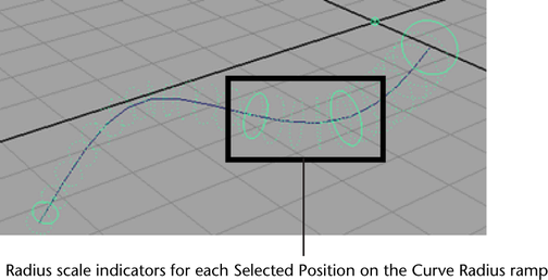 The overall radius of the volume axis field on a curve is set using Section Radius. Using the Curve Radius ramp, you can vary Section Radius along the length of your volume axis curve. When a position marker is added to the Curve Radius ramp, a Radius Scale indicator is placed on the curve in the scene view. These indicators show the points on your NURBS curve where Curve Radius is scaled to specific values.