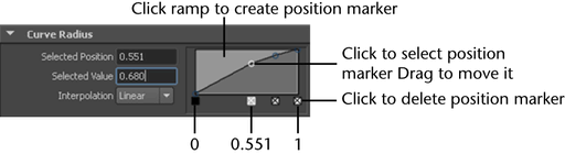 • Click the ramp to create a Selected Position for a Section Radius value. The left position on the ramp represents Section Radius at the base of the curve, while the right position on the ramp represents a Section Radius at the tip of the curve.