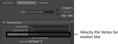 The velocity per-vertex data is passed to the output mesh through the polySurfaceShape node’s color set named Motion Vector Color Set. By default, this color set uses the velocityPV data generated from the fluid object.