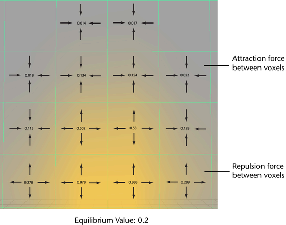 For example, if you set Self Force to Density, and the Equilibrium Value to 0.2, voxels that have a current density of less than 0.2 pull density from surrounding voxels, while voxels with a current density greater than 0.2 push density into surrounding voxels. Voxels with a current density of 0.2 are in a state of equilibrium and do not generate a force. See Equilibrium Value.