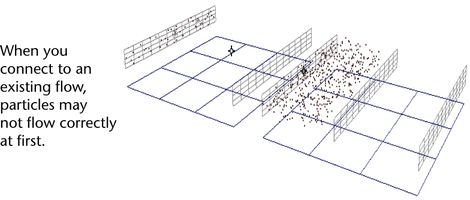 You can connect flows from separate surfaces so they share the same particles. The workflow is different depending on whether you create flows at the same time or start with an existing flow.