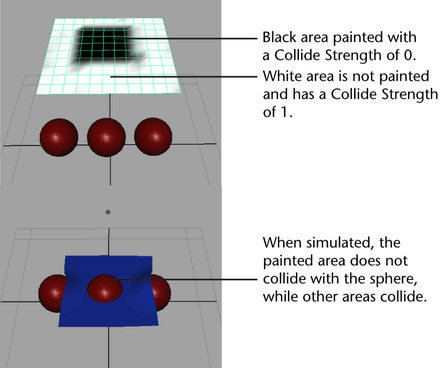Using the Paint nCloth Attributes Tool, you can paint Collide Strength values on nCloth and passive collision objects on a per-vertex basis. Painting Collide Strength values lets you disable or dampen the force of collisions for selected vertices without needing to create Disable Collision constraints.