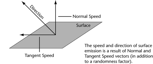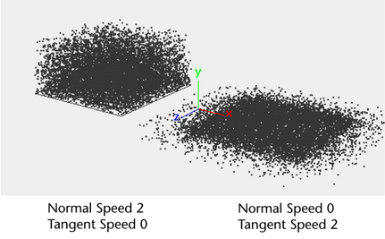 Sets the magnitude of the tangent component of emission speed for surface and curve emission (see the following figures). The default value is 0. You can enter a value of 0 or greater. Valid for surface and curve emitters only.