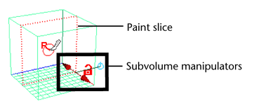 You control the location and thickness of the slices you paint using the fluid manipulators that appear at a corner of the slice. For details, see Display subvolumes of 3D containers.