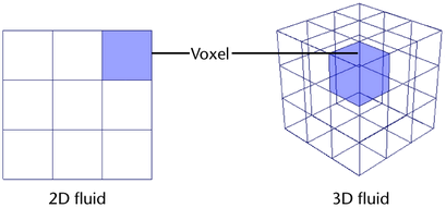 When you define a fluid property as a grid, you can place different property values in each individual grid unit called a voxel (volume pixel). Grids give you precise control over what the values are in the container. There are two types of grids: dynamic and static.