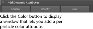 2. Select the emitted particles and add a per particle color attribute (rgbPP) from the Add Dynamic Attributes section of the Attribute Editor.