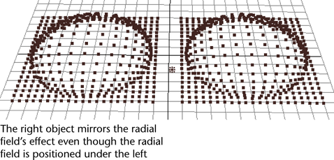 Suppose you create a particle grid and connect it to a radial field positioned below it. You create a duplicate of the particle grid with Duplicate Input Connections, then move the duplicate grid to a new position. The right object mirrors the radial field’s effect even though the radial field is positioned under the left object.