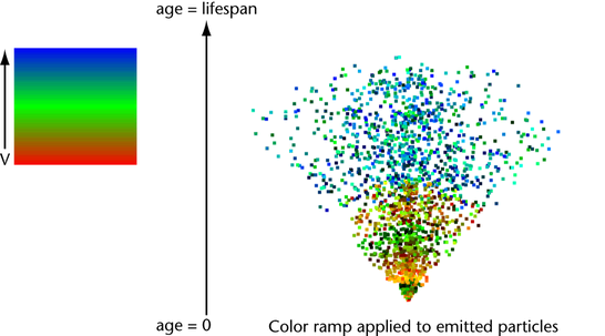 Use a 2D ramp texture to control per-particle attributes such as a particles age as well as setting rgbPP, opacityPP, andradiusPP attributes . A ramp texture is a 2D texture in which the color or grayscale value changes from one value to another across the extent of the image.