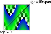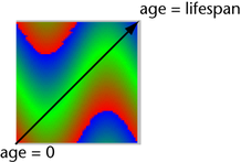 If you edit ramp attributes to create a ramp such as the following example, selecting Particle’s Age for both Input U and Input V adds versatility to your control of the attribute: