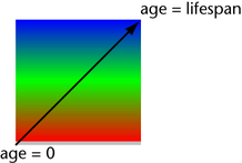 At the middle of the lifespan, the value of the attribute equals 0.5, because the R component at the bottom of the ramp is 0.5. (The color is gray, with an RGB value of 0.5, 0.5, 0.5.)