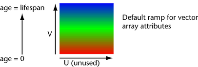 A ramp has two inputs—U (horizontal) and V (vertical). By default, the V input of the array mapper is connected to the particle’s age and the U input is not connected. You can change these input connections when you are creating the ramp.