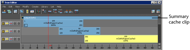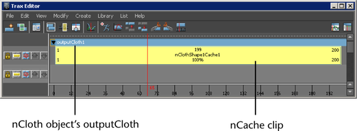 All the selected object’s cache nodes are loaded into the Trax Editor as cache clips. Each clip is placed on its own track, and all your object’s cache clips are grouped under your object’s cache label: outputCloth for nCloth caches, nParticleShape for nParticle caches, and fluidShape for fluid caches.