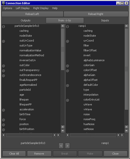Depending on the particle attribute you use to drive the shader attribute, Maya either displays the new Particle Sampler Info node in the Attribute Editor or the Connection Editor.
